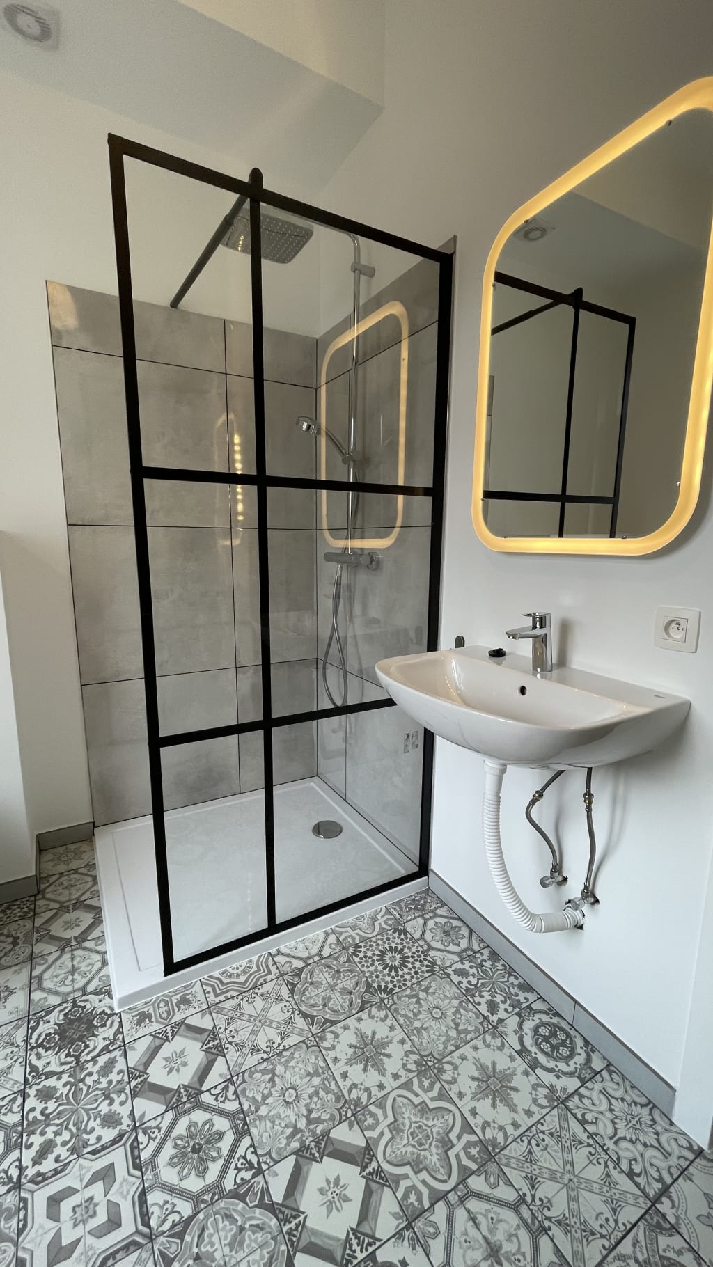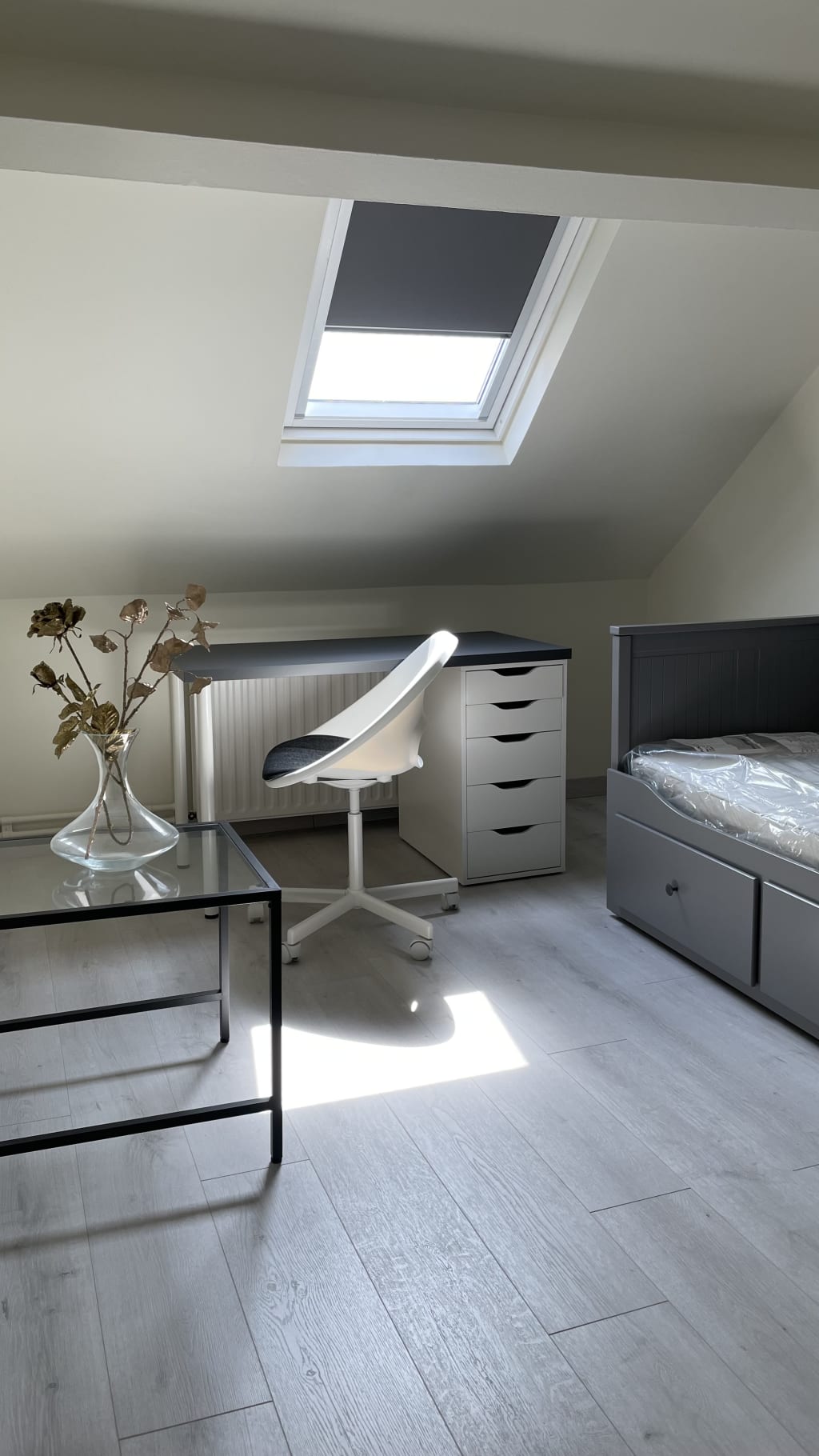 Chambre (sous les combles): 12m2, douche et wc partagé avec un garçon.