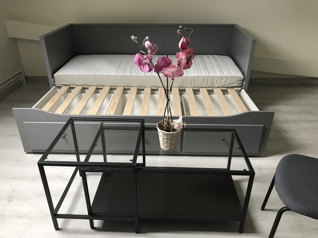 A disposition du locataire : meubles (lit simple qui devient double, 2 matelas, bureau, armoire), cuisine super équipée avec coin à manger, deux frigos, espace pour vélos, petite cour extérieure, machine à laver et sèche-linge.