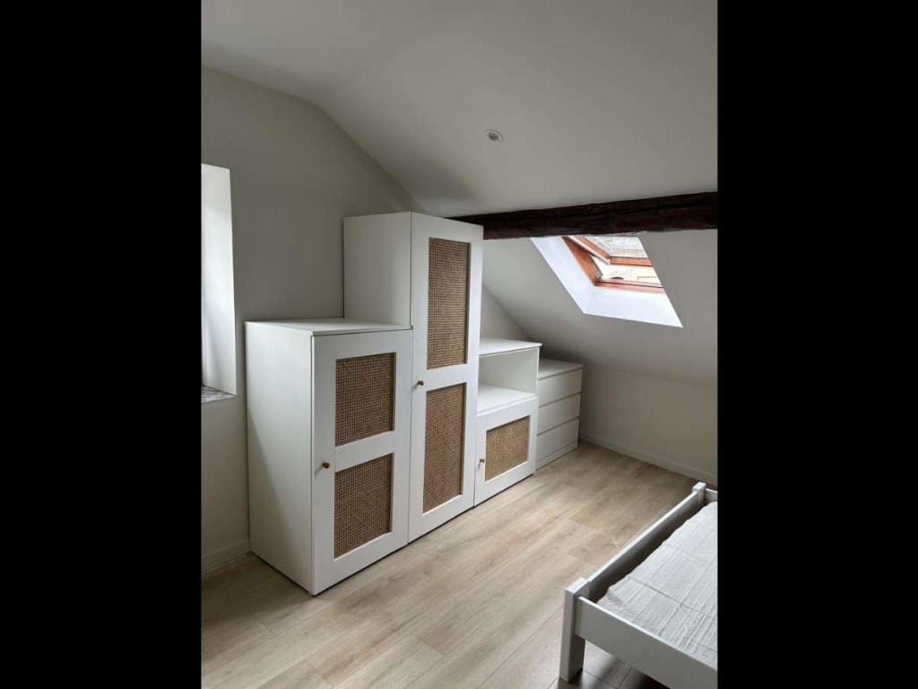 - 3ème étage : chambre mansardée de 17m2, Velux et fenêtre avec store occultant, sommier d’1m40, bureau et chaise de bureau, dressing fait sur mesure, salle de bain avec douche italienne, WC et meuble de salle de bain