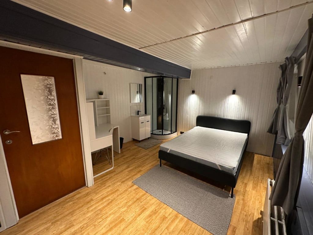 Chambre 1 : 14m2 (lit 140x200 + matelas, bureau + chaise, garde-robe, douche privative, lavabo)