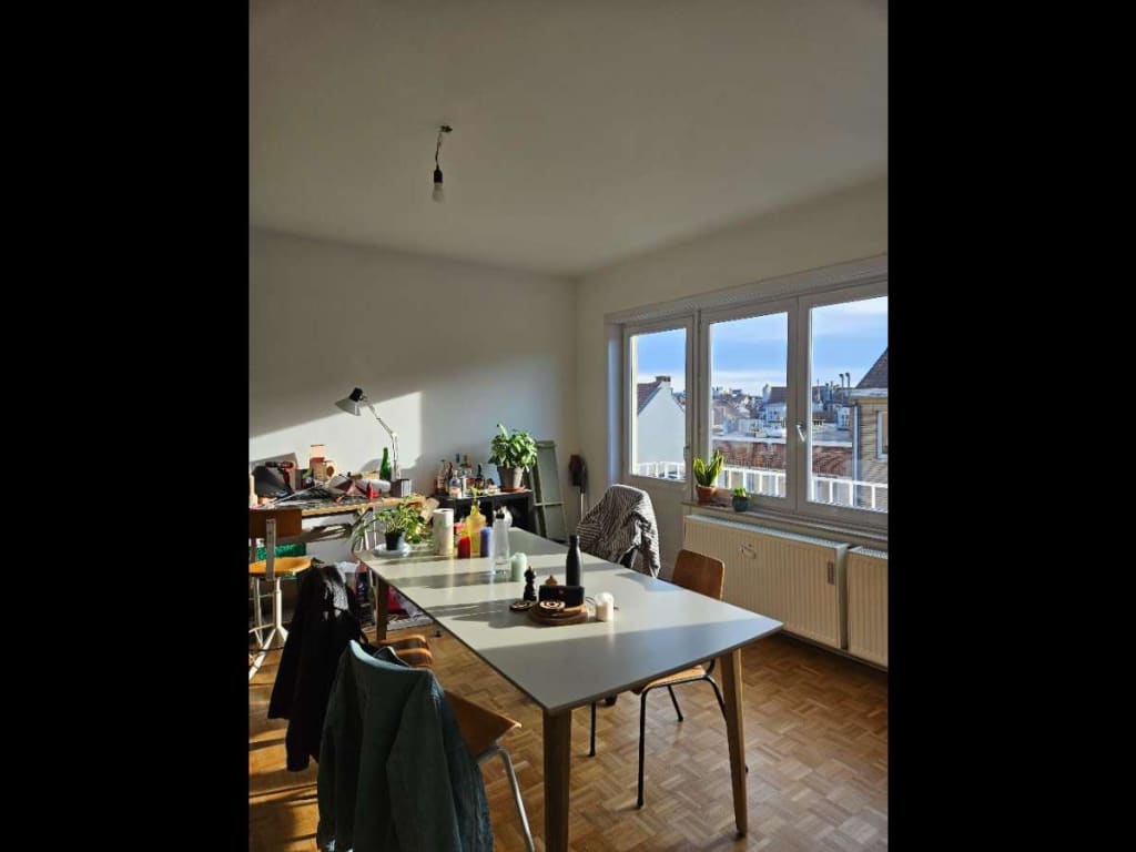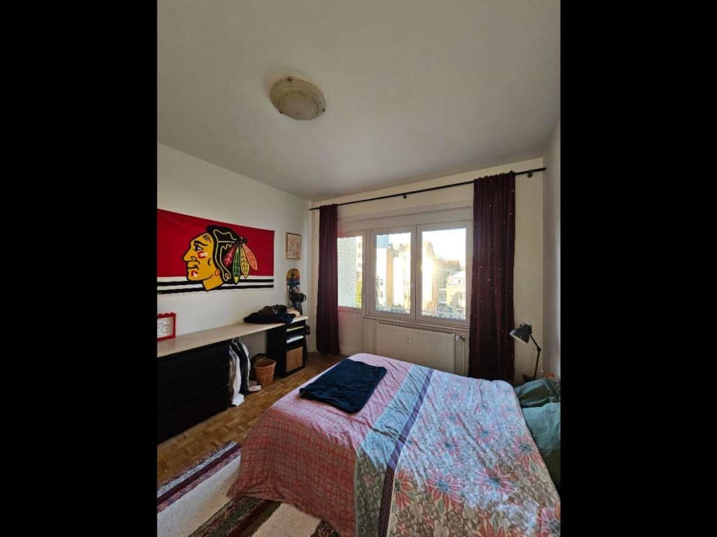 Disponible de début avril à fin septembre (dates flexibles à discuter), une chambre de 13 m² avec sa loggia, dans un appartement de 90 m², partagé avec l’humoriste en rodage et architecte de talent Théo (28 ans).