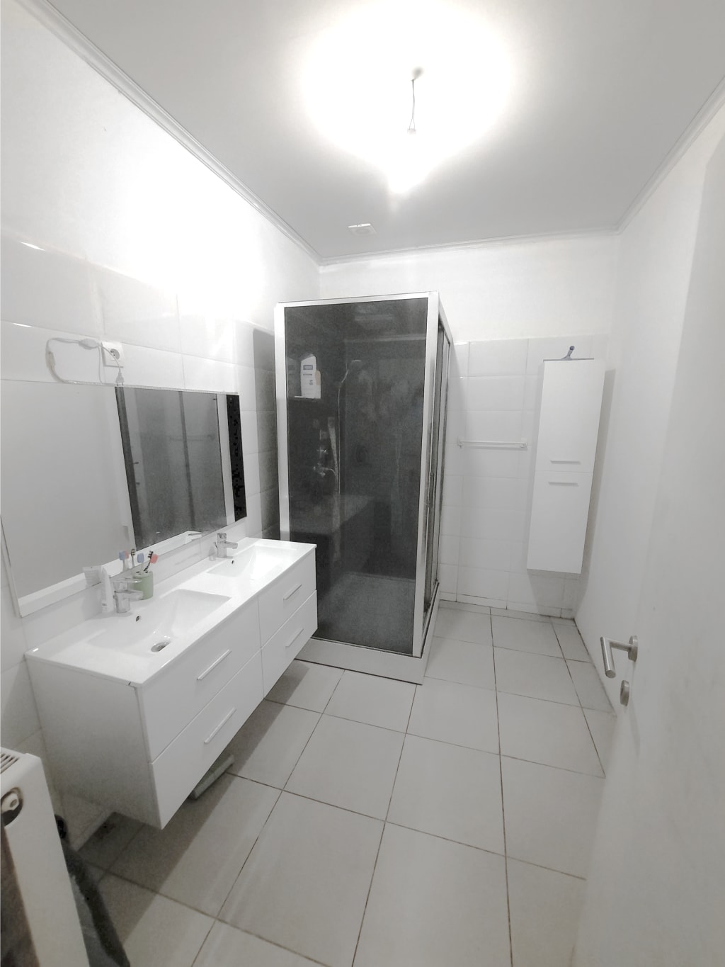 Salle de douche avec lavabo double, toilette, lave-linge, cordes-à-linge.