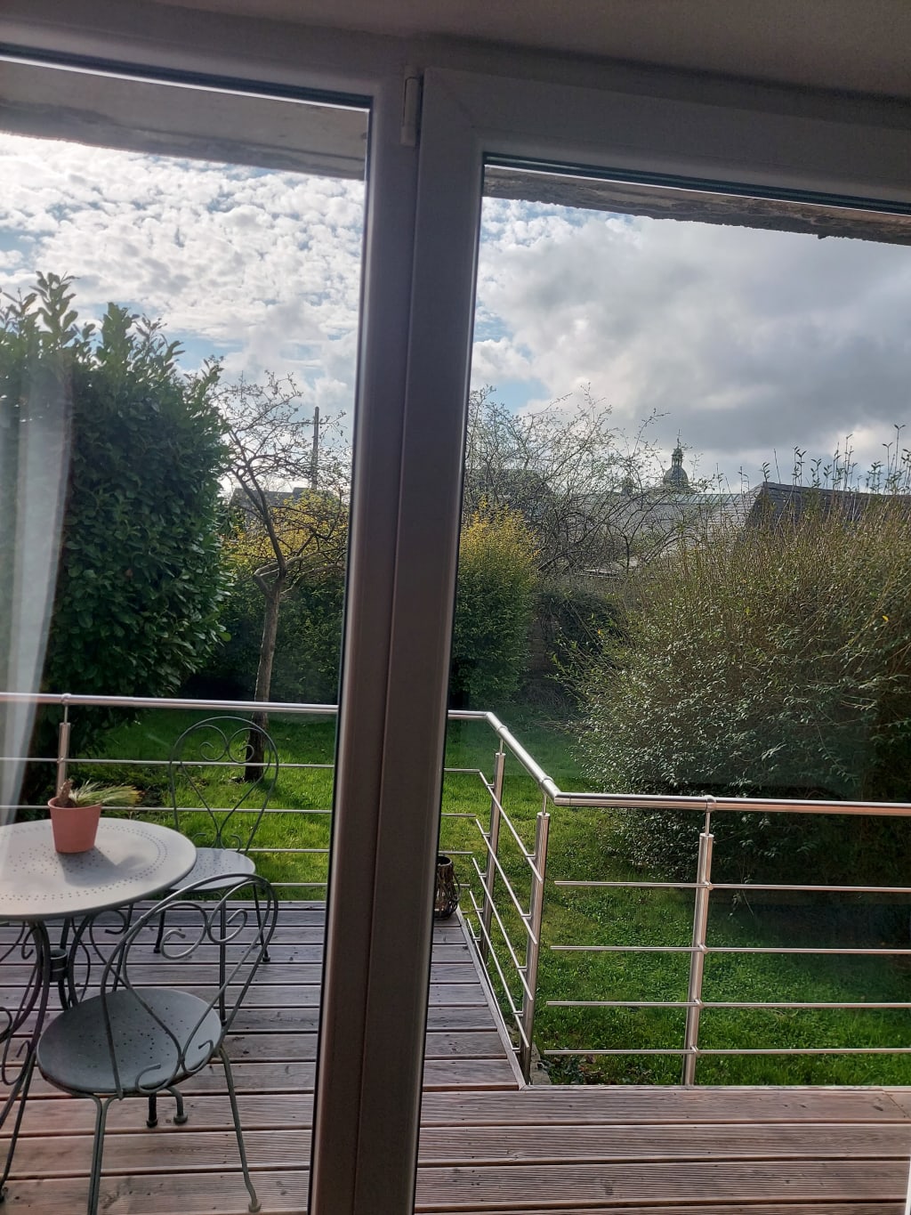 jardin privé pelouse et petit pommier privé et entourré de hauts murs terrasse privée ( surélevée vue sur jardin ) pour petite table et 2 chaises cave avec espace pour vélo CHAMBRE ET LIT POUR UNE SEULE PERSONNE