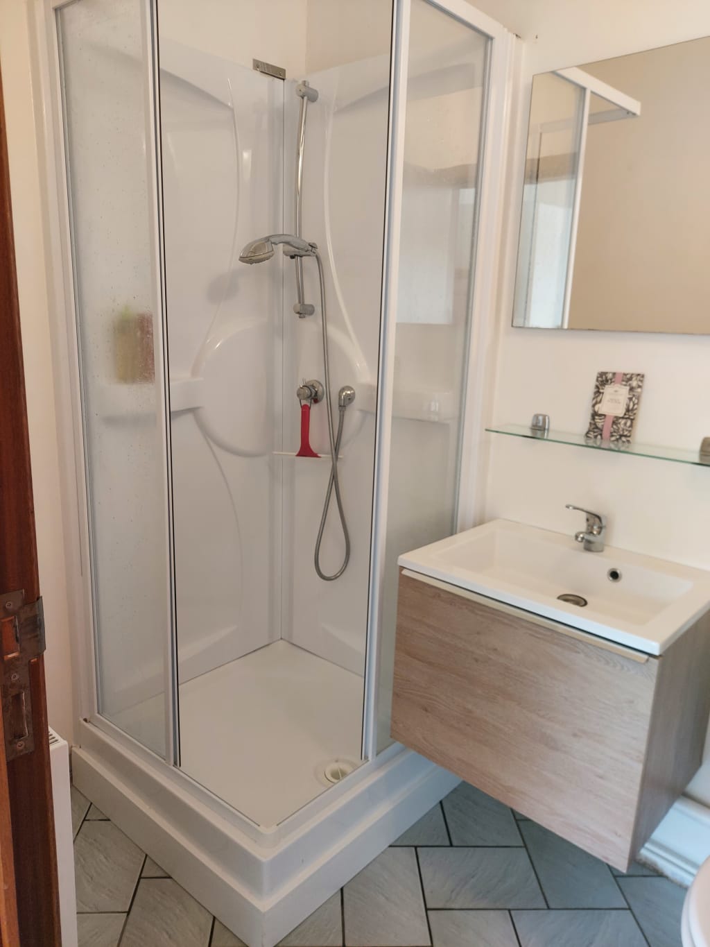 studio 1 ch côté jardin au rez de chaussée pour immeuble à 2 étages poubelles gratuites salon avec bureau étagères ,tv divan convertible cuisine privée équipée et douche privée terrasse et jardin privés entourrés de hauts murs contrat minimum 3 à 4 mois à prolonger si nécessaire avec nouveau contrat