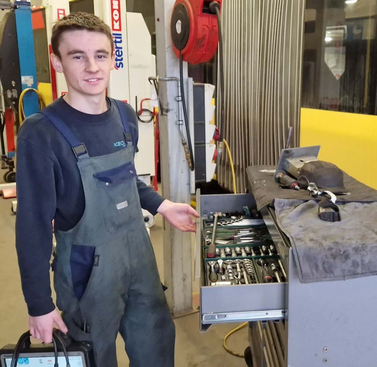 Jaan toont fier zijn werkbak, die altijd netjes en ordelijk opgeruimd is. โIk ruim mijn materiaal altijd op nadat ik aan een bus gewerkt heb. Ik zie meteen of ik in een voertuig iets vergeten ben. Dit heb ik thuis geleerd!โ