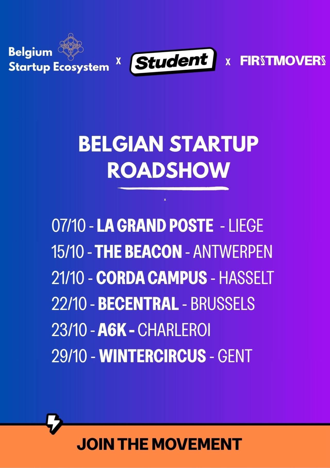 Student, het Belgium Startup Ecosystem en FirstMovers bundelen de krachten voor een unieke roadshow doorheen Belgiรซ.